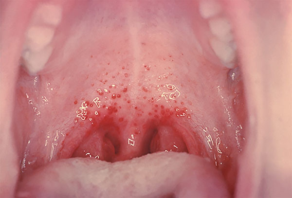 Patient exhibiting redness and edema of the oropharynx, and petechiae on the soft palate Source: Centers for Disease Control and Prevention/Heinz F. Eichenwald, MD |