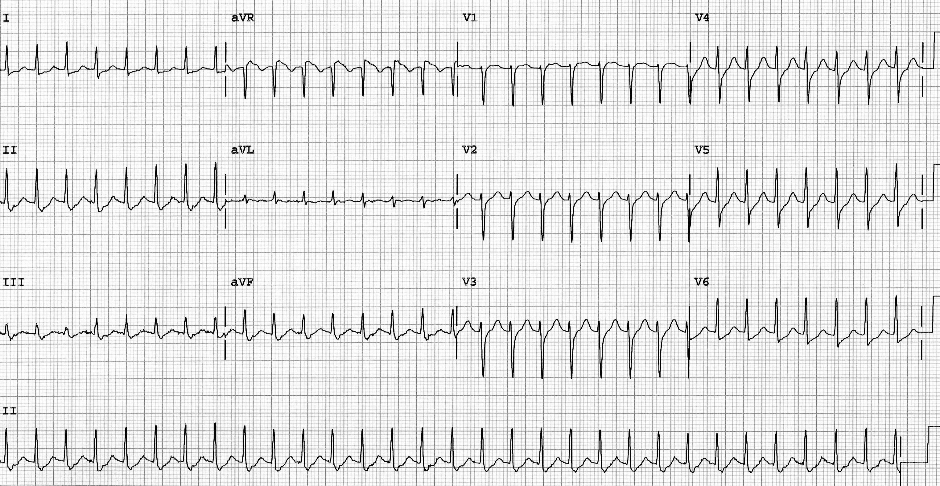 - With a wide complex tachycardia, very wide QRS complexes (> 160 msec) and negative QRS deflection in all the precordial leads (“negative concordance”) suggest the rhythm is ventricular tachycardia as opposed to supraventricular tachycardia with aberrancy.