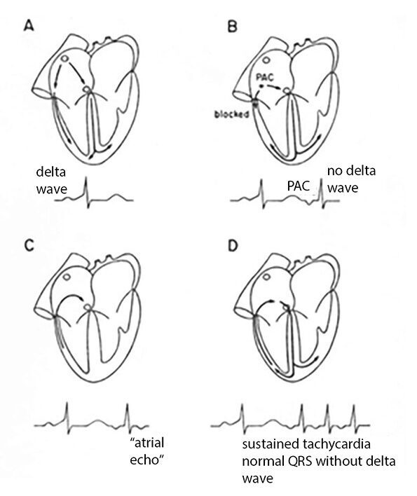 During sinus rhythm, pre-excitation of the ventricle creates the delta wave on the electrocardiogram. During AVRT, the ventricles are only activated via the His-Purkinje system and there is no delta wave. Image courtesy of J. Stephan Stapczynski, MD |