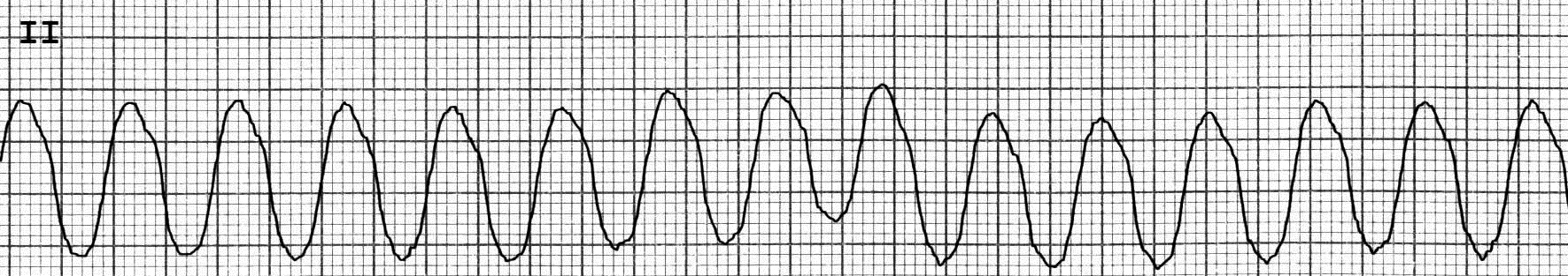 Ventricular fibrillation is diagnosed on cardiac monitoring by the presence of fibrillation waves with varying amplitude with no identifiable P waves, QRS complexes, or T waves, with a rate of 150 to 500 beats per minute.49 (See Figure 10.)