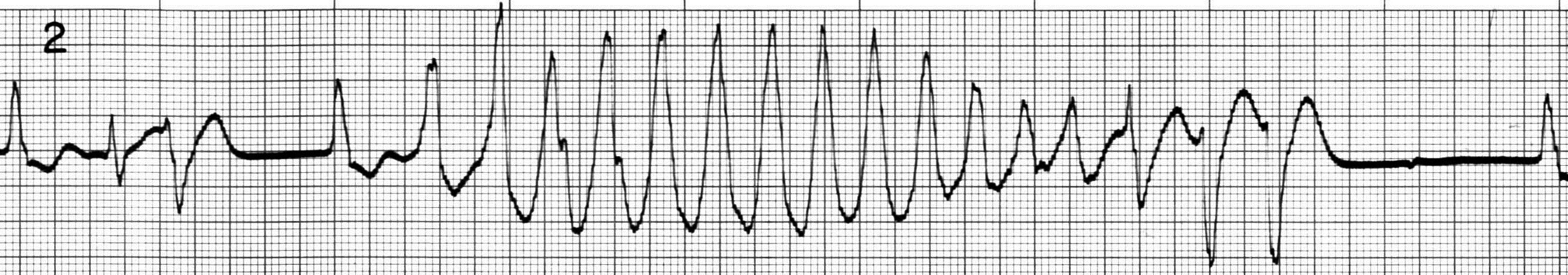 Lead II, monomorphic ventricular tachycardia at a rate of 142 beats/min Image courtesy of J. Stephan Stapczynski, MD |