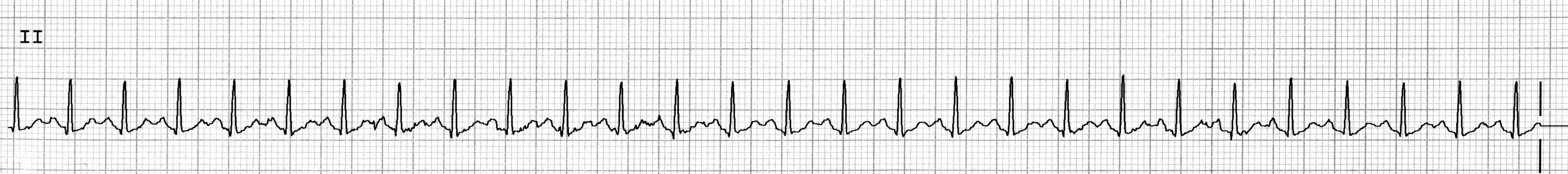Sinus tachycardia is defined by the presence of a regular rate and rhythm with a ventricular rate higher than 100 beats per minute with the following ECG features: the presence of upright P waves in leads I, II, and avL; a negative P wave in avR; and each P wave is followed by a QRS complex and T wave.33 (See Figure 2.) The QRS complex typically is normal and narrow (QRS duration < 120 msec) unless there is a preexisting conduction abnormality, such as a bundle branch block.