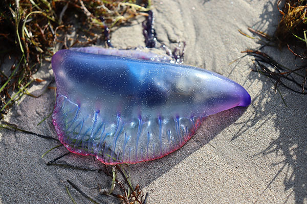 Commensal aquatic organisms of the order Siphonophorae are another type of cnidarian, which are very similar in appearance to most jellyfish but are a colony of smaller individuals with different specialized morphologies to assist the colony as a whole. Like the Hydrozoans, they have dart-like nematocysts, which can puncture human skin, resulting in severe reactions and occasionally death. The most encountered siphonophore of medical significance is the Portuguese man o’ war, Physalia physalis, a large creature that can grow to impressive sizes. (See Figure 3.) Patients who are stung by these describe a severe burning sensation, and due to the large size of these animals, swimmers who get caught up in their long tentacles are at significant risk for excruciating, debilitating stings, which can result in drowning due to the severity of the pain or systemic inflammatory responses. These organisms tend to “bloom,” with thousands of specimens appearing suddenly during certain times of the year, only to die off as suddenly as they appeared. Patients may present with numerous linear red stings. Treatment of these stings is identical to treatment of other jellyfish stings: hot water, acetic acid, and sodium hydroxide paste.44,45