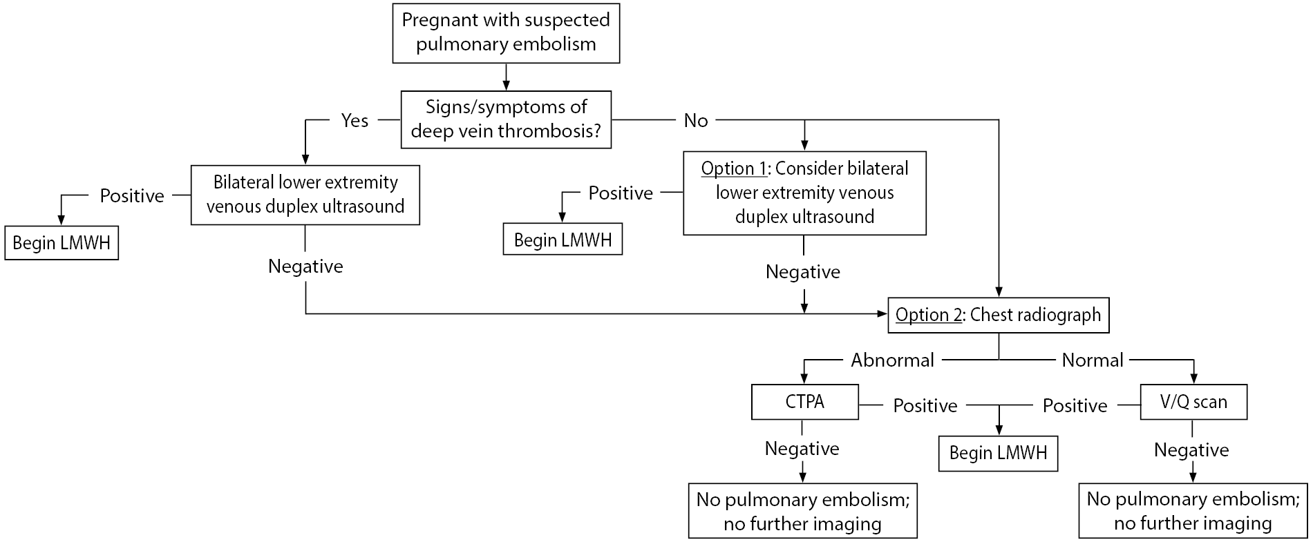 Key: LMWH: low molecular-weight heparin; CTPA: computed tomography pulmonary angiogram; V/Q: ventilation perfusion |