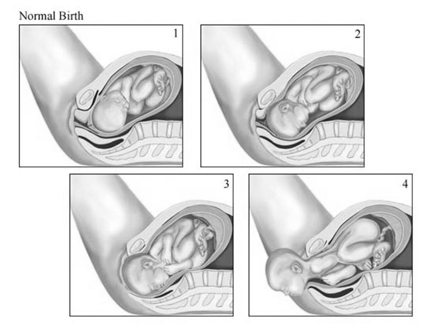 1. Fetal engagement begins 2. Further descent, fetal rotation begins 3. Fetal rotation completes, extension begins 4. Complete fetal extension Source: © Relias LLC 2024 |