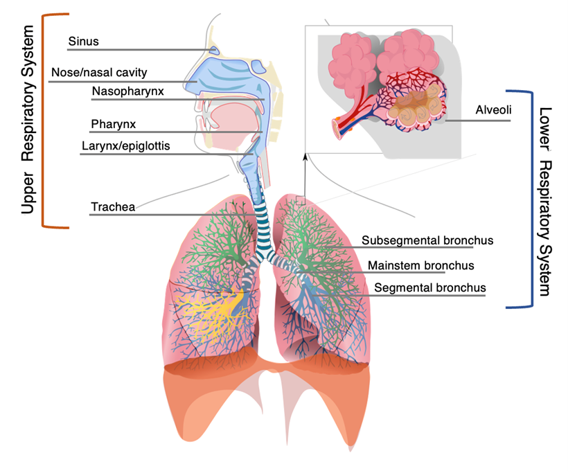 Lower respiratory tract infections are caused by both viruses and bacteria. The most common viruses include RSV, influenza, and HMPV viruses, whereas bacterial causes range from the typical (Staphylococcus aureus, Streptococcus pneumoniae, and Streptococcus pyogenes) to the atypical (Chlamydia trachomatis/pneumoniae and Mycoplasma species).6,8,9 These infections are defined by inflammation, irritation, and eventual propagation of bacteria/viruses/fungi into the lung parenchyma. They may require antimicrobials to treat.1,6,10 These infections result in bronchitis, bronchiolitis, and pneumonia.7 The anatomical breakdown of an upper vs. lower respiratory tract infection is detailed in Figure 1.