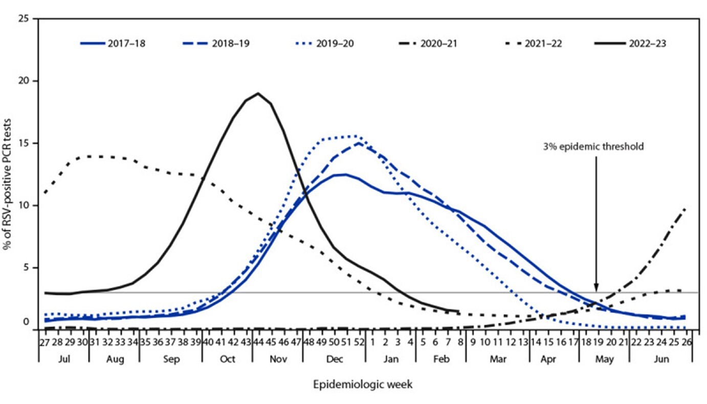 - Hamid S, Winn A, Parikh R, et al. Seasonality of respiratory syncytial virus — United States, 2017-2023. MMWR Morb Mortal Wkly Rep 2023;72:355-361.