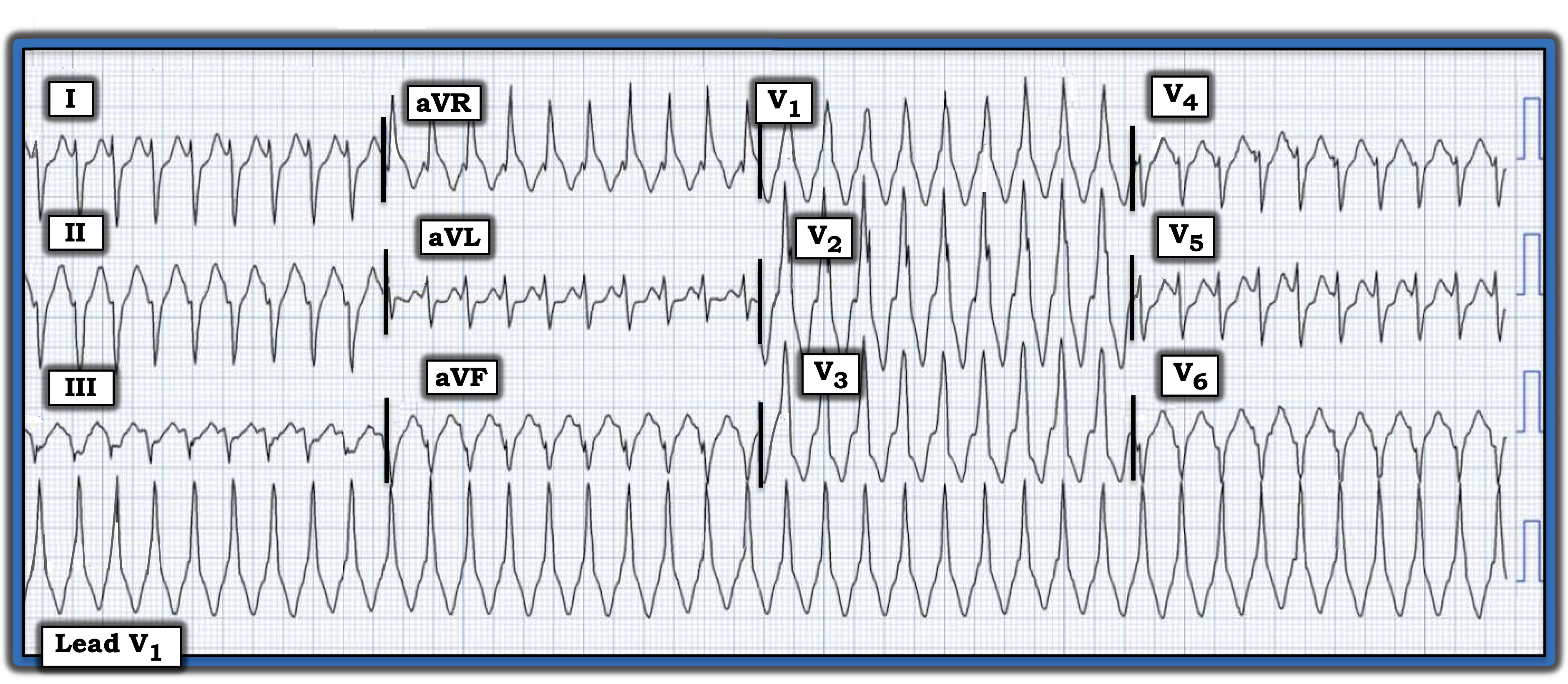 Interpretation: The ECG in the figure represents a regular wide-complex tachycardia (WCT) at ~225 beats/minute, without clear sign of atrial activity.