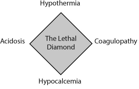 Commonly known as the “lethal triad,” the development of hypothermia, coagulopathy, and acidosis in the injured patient describes the physiological insult that causes disseminated intravascular coagulopathy and directs resuscitation efforts. More recently, “the lethal diamond” has been introduced to include calcium, since all of these mechanisms potentiate one another and exacerbate traumatic hemorrhage and shock.9 (See Figure 1.)