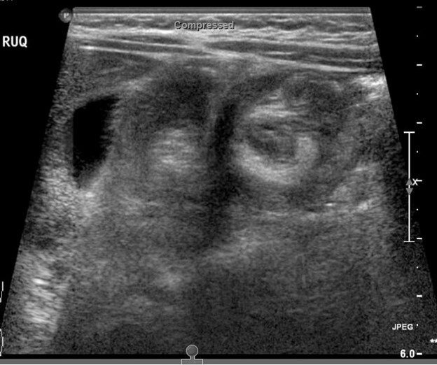 The top image is a radiograph with intussusception visible along the edge of the liver. The bottom image is an ultrasound of intussusception. Images courtesy of Derya Caglar, MD. |