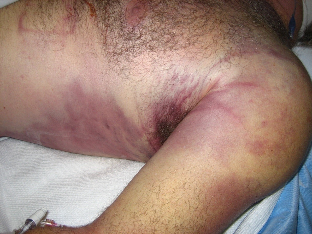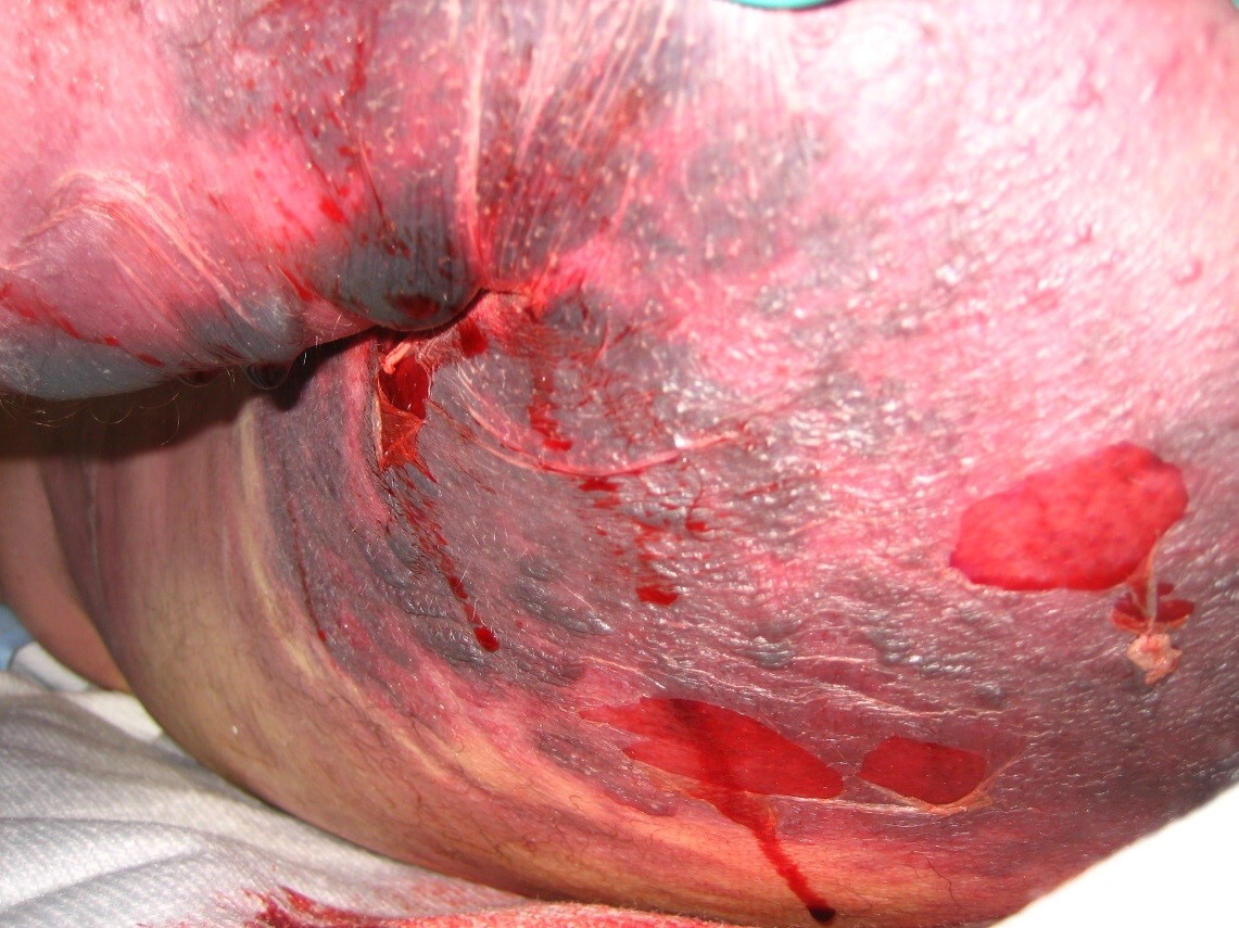 Necrotizing fasciitis is characterized by extensive soft tissue necrosis of the superficial, fascial, and deep dermal layers of the skin that can lead to thrombosis, necrosis, systemic toxicity, and death.3, 4 However, early in the course, these infections can appear deceptively benign. Infections typically begin with direct invasion of the soft tissues from external trauma, which could be as small as an insect bite. Once bacteria are in the subcutaneous tissues, they invade deeper tissues and release toxins, leading to capillary thrombosis, tissue ischemia, liquefaction necrosis, and systemic toxicity. This ischemic environment leads to rapid bacteria growth that spreads infection along fascial lines, and patients can deteriorate within a matter of hours.