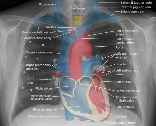 Source: Mikael Haggstrom, MD https://commons.wikimedia.org/wiki/File:Mediastinal_structures_on_chest_X-ray,_annotated.jpg |