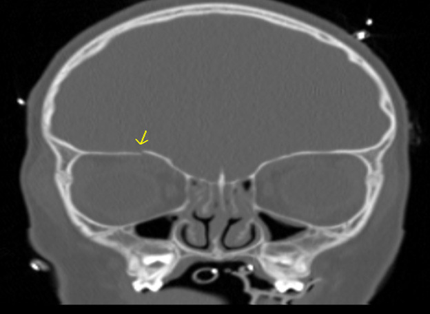Figure 3 shows an example of an orbital roof fracture in a pediatric patient in the coronal plane. The image demonstrates a mildly displaced fracture.
