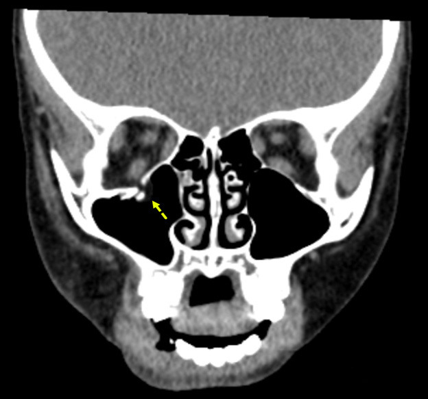 Figure 5 shows an example of an orbital floor fracture without evidence of entrapment in a pediatric patient in the coronal plane. In comparison, Figure 6 shows an entrapped orbital floor fracture in the bone window. The image reveals evidence of a non-displaced orbital fracture with entrapped intra-orbital fat.