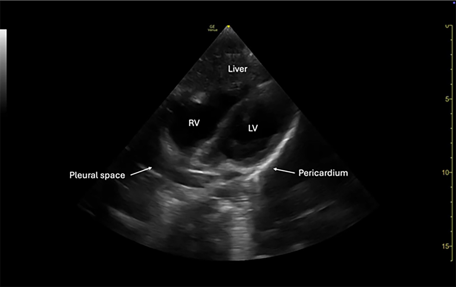 This view is used primarily to assess for pericardial effusion, which may indicate cardiac injury or tamponade physiology in the setting of blunt or penetrating trauma. The goal is to obtain a complete four-chamber view of the heart to evaluate for anechoic fluid surrounding the myocardium, typically appearing between the posterior pericardium and right ventricle.38 It also is helpful for assessing right ventricular collapse, chamber compression, or a “swinging heart” in cases of tamponade.