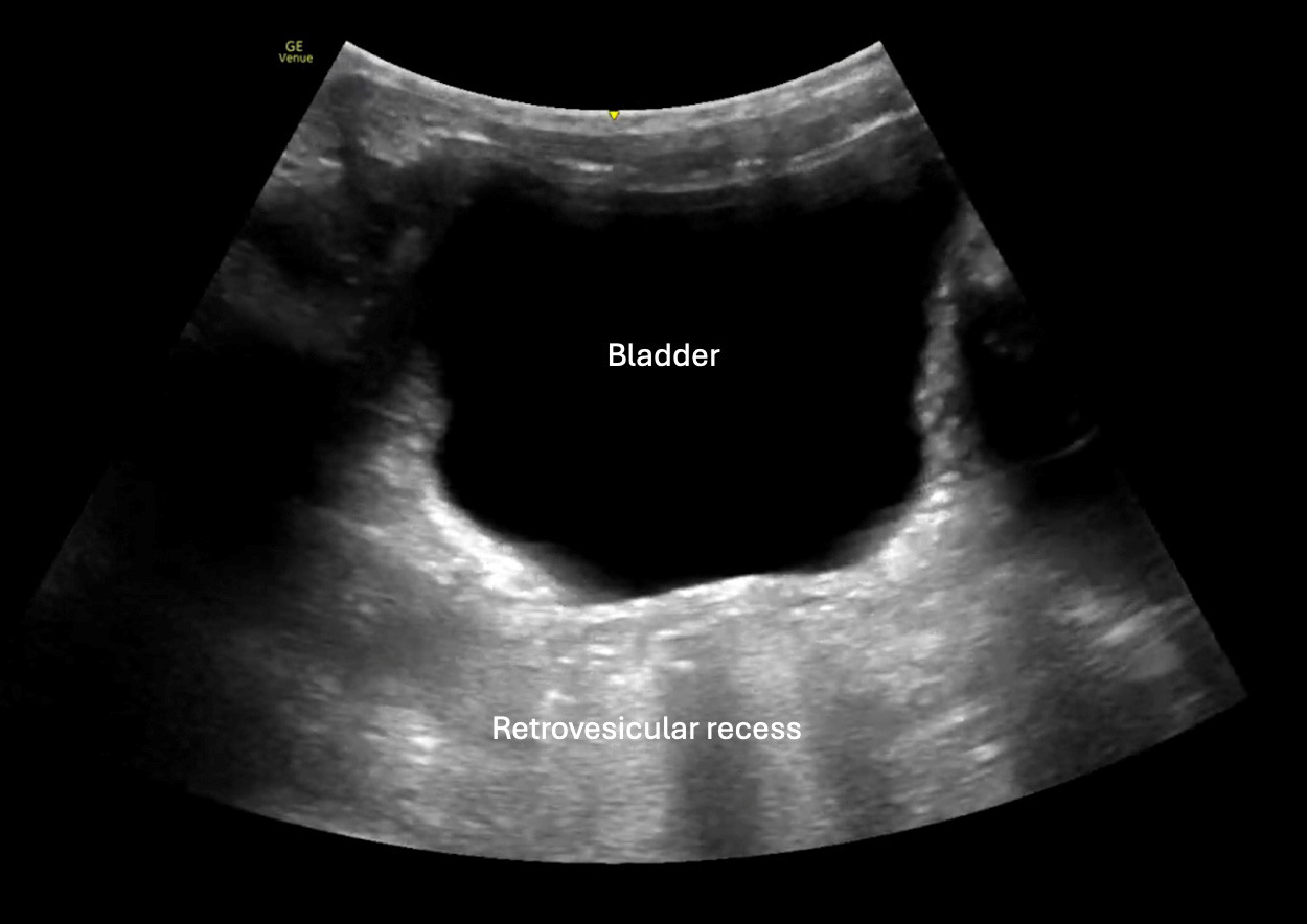 Limitations of this view include inadequate bladder filling, bowel gas artifact, and patient discomfort, which can affect image quality. Using a gentle technique and maintaining good probe contact with ample gel can improve visualization. As stated, a full bladder also may enhance diagnostic accuracy by serving as an acoustic window to the posterior pelvic space.29