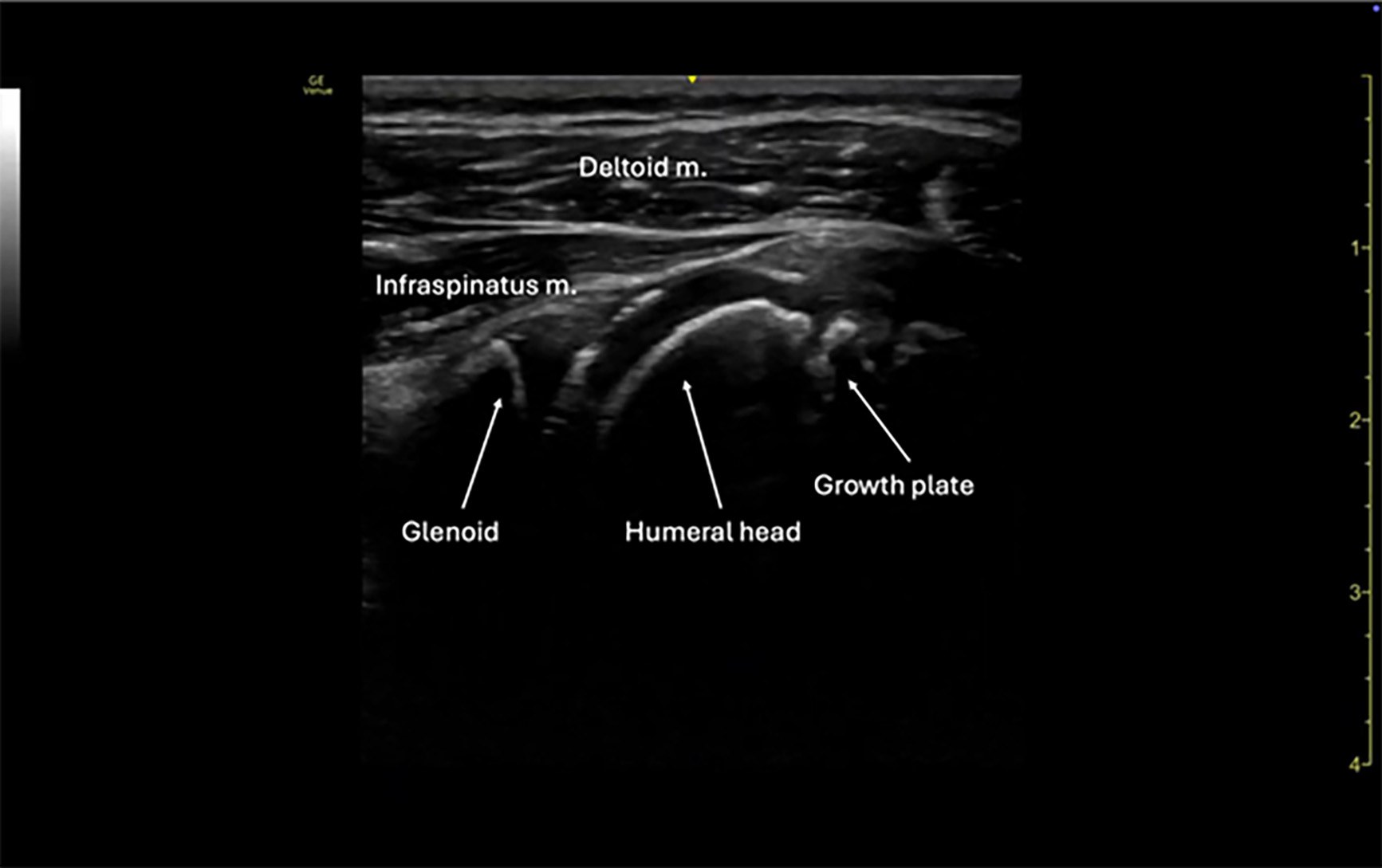 Ultrasound is an increasingly valuable imaging modality in the evaluation of pediatric shoulder injuries, particularly in trauma settings where rapid, radiation-free assessment is preferred. Children present unique challenges in musculoskeletal imaging because of open growth plates (physis), increased cartilage content, and variable ossification, which may limit the sensitivity of traditional radiography for detecting subtle injuries. The shoulder area is a common site of injury in active children, with clavicle fractures, proximal humeral fractures, and anterior shoulder dislocations, respectively, being most common.50
